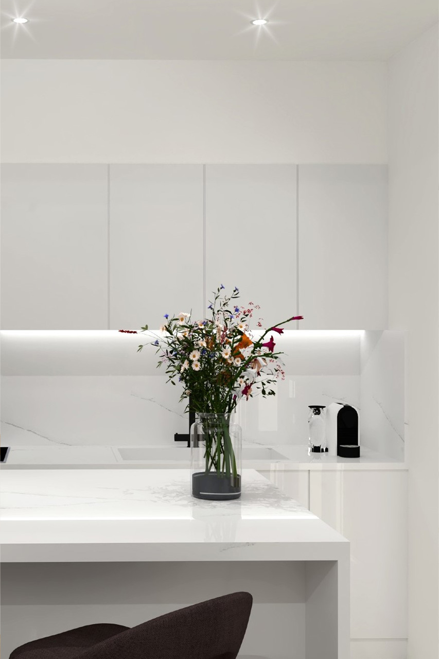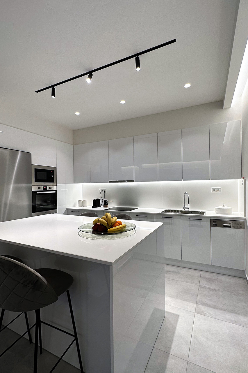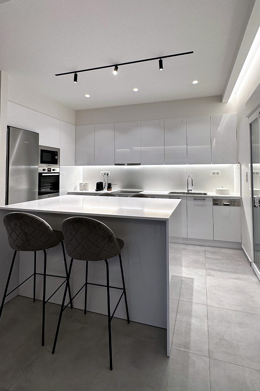 Η μινιμαλιστική διακόσμηση με κύριο χαρακτηριστικό την επικράτηση του λευκού που ακολουθήθηκε δίνει έμφαση μόνο στα απολύτως απαραίτητα, αποκλείοντας όλα τα περιττά στοιχεία. Το στυλ είναι χαλαρωτικό, γαλήνιο και ήρεμο χαρίζοντας μία σύγχρονη και μοντέρνα εμφάνιση στην κατοικία.