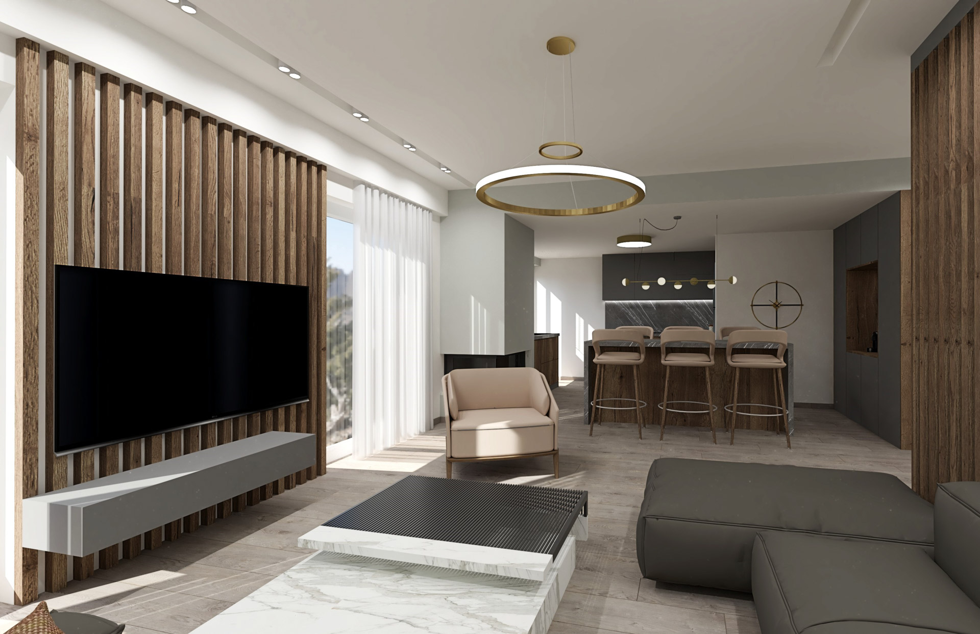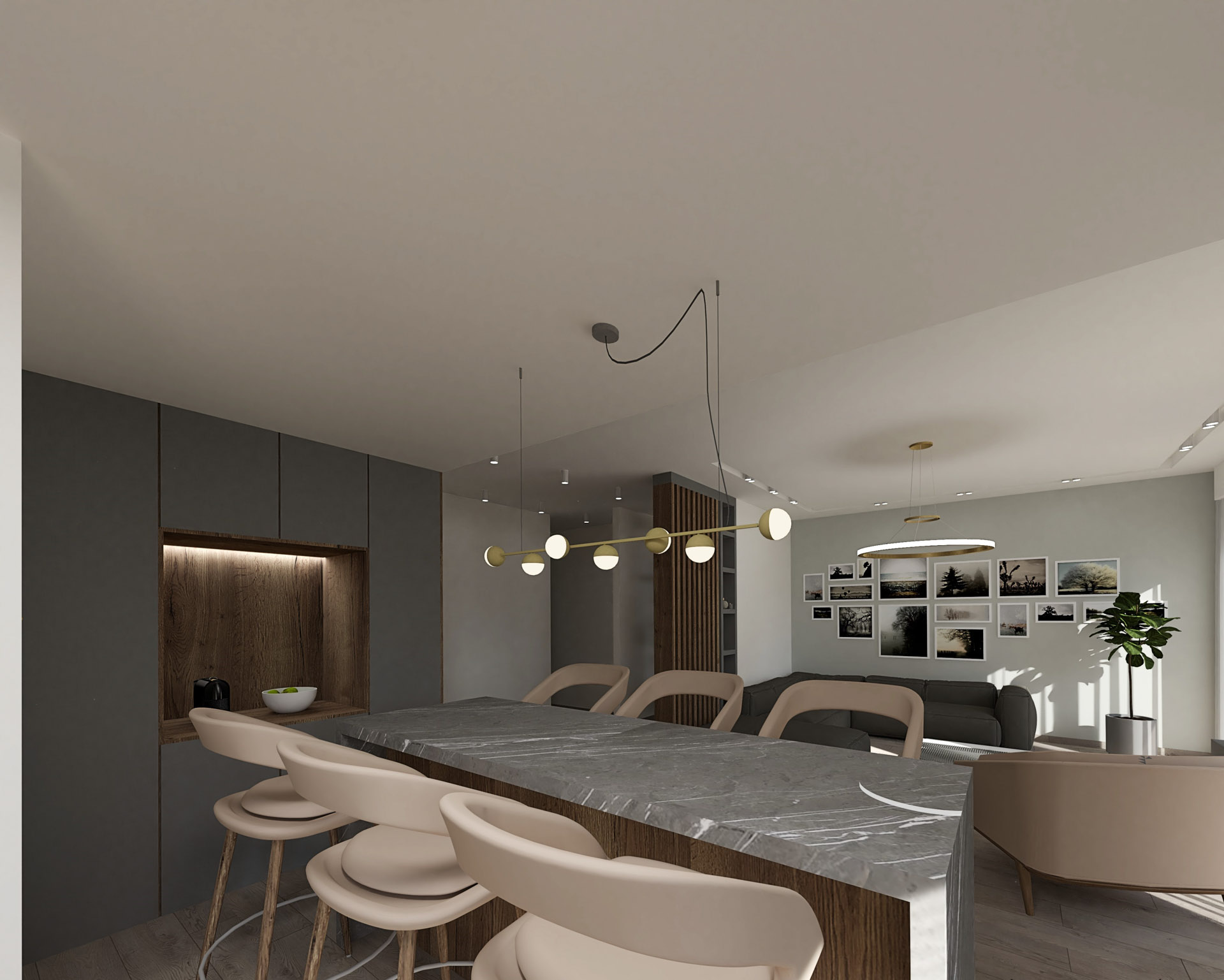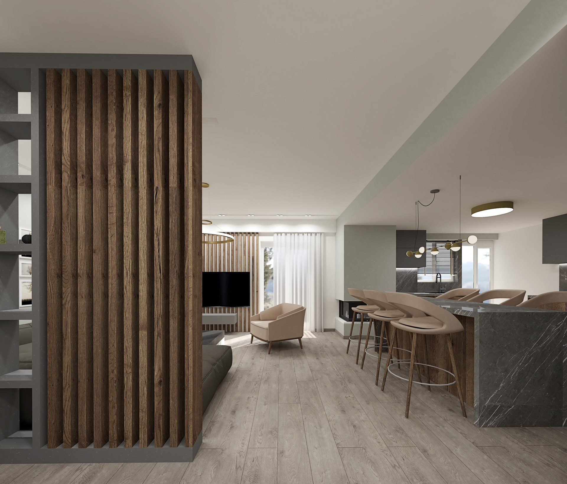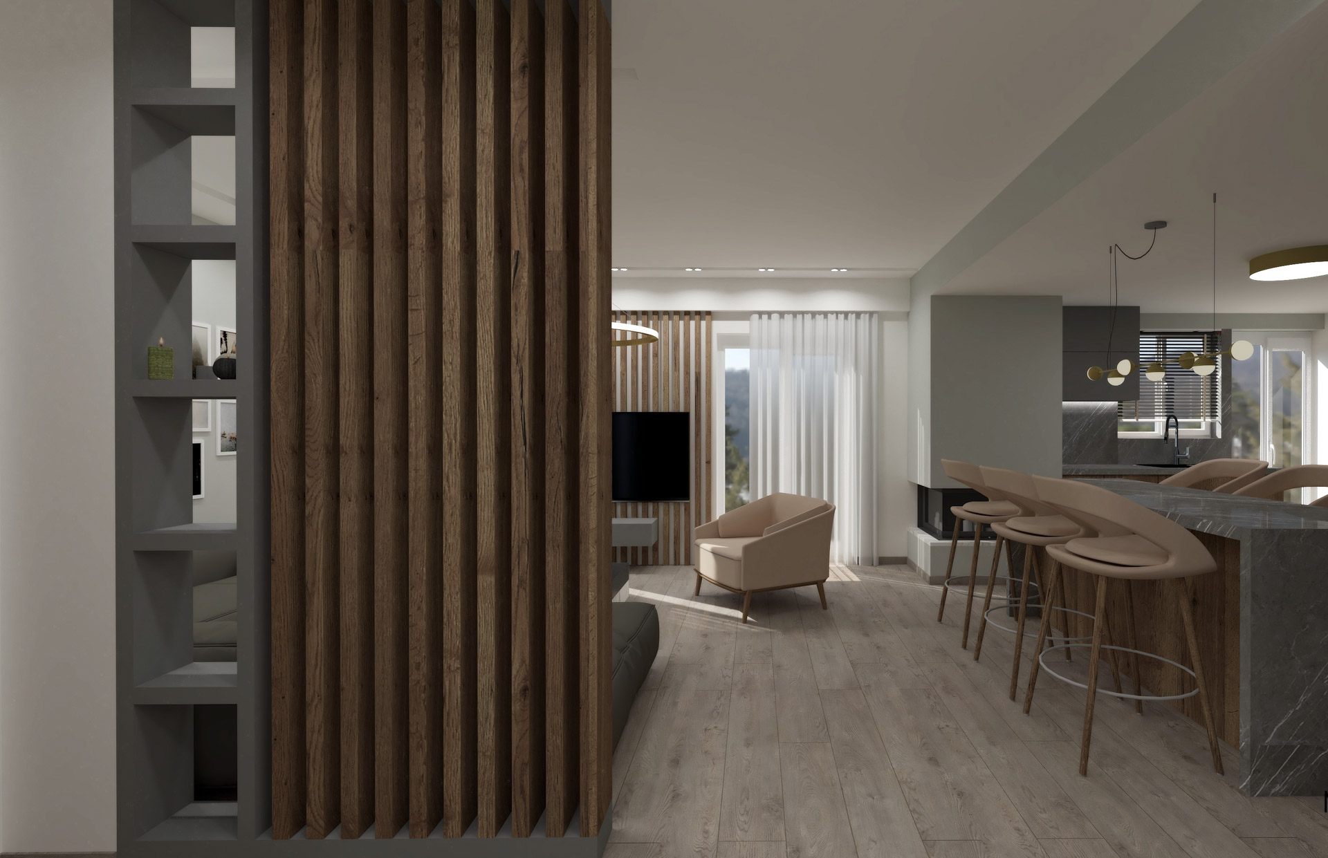 Το έργο αφορά διαμέρισμα πολυκατοικίας του 1980 επιφάνειας 90τ.μ. στην πόλη των Ιωαννίνων. Στόχος του σχεδιασμού ήταν μια διαρρύθμιση που θα έδινε στο διαμέρισμα καλύτερη ροή αλλά και ευέλικτους χώρους. Χρησιμοποιώντας μια παλέτα του γκρι αλλά και εξοπλίζοντας με ξύλο καρυδιάς τον κεντρικό όγκο του πυρήνα της κατοικίας δημιουργήσαμε ένα χώρα που προσφέρει μια ζεστή υφή με μία ατμοσφαιρική διάθεση.