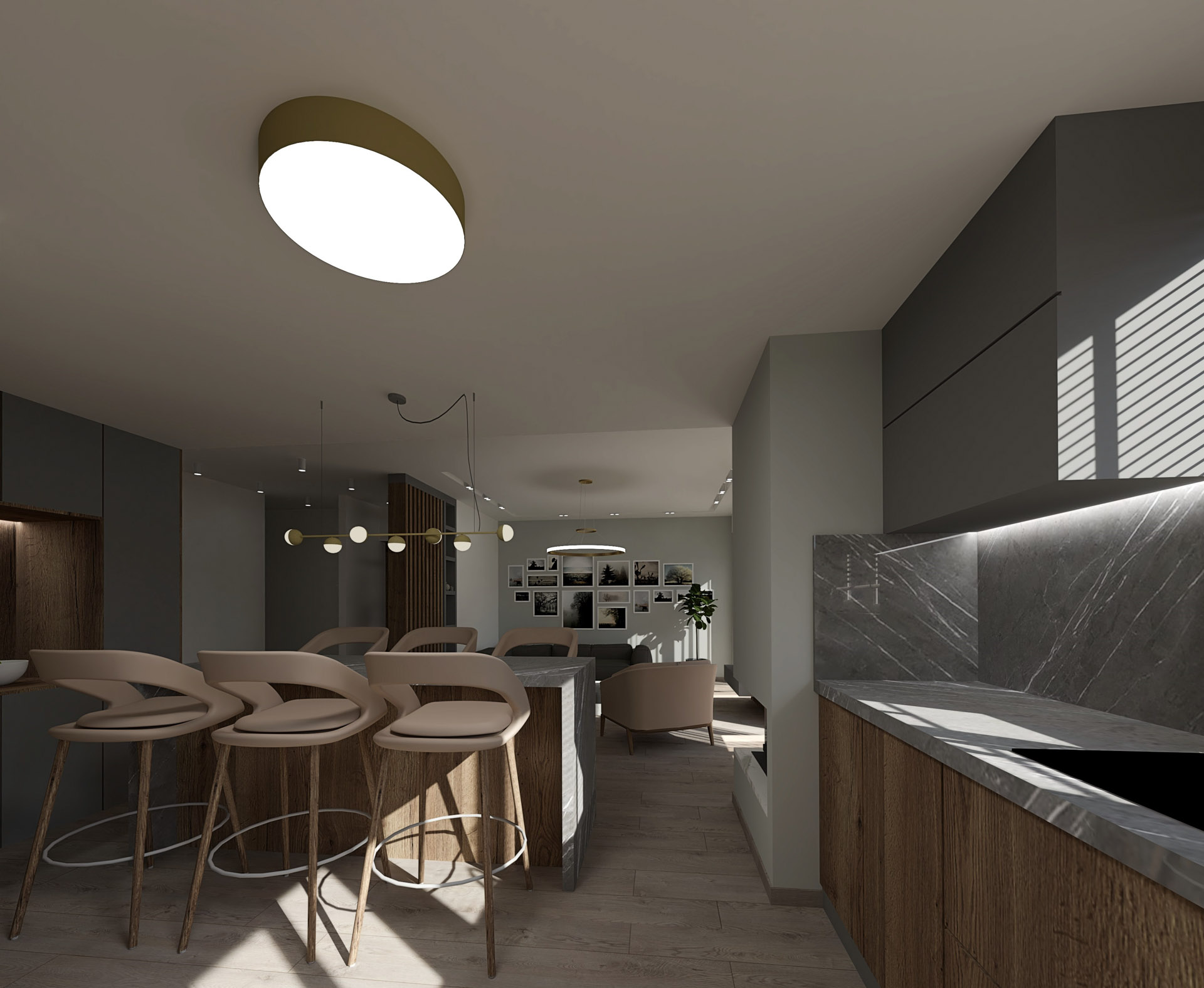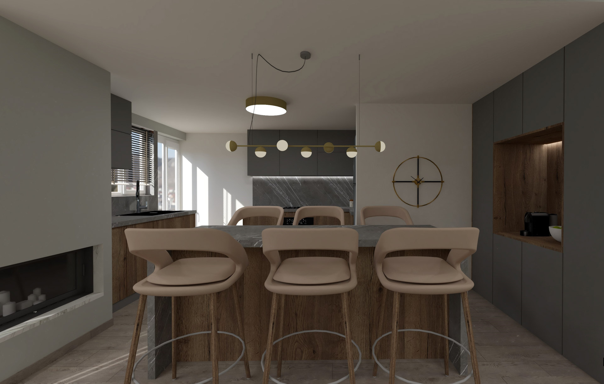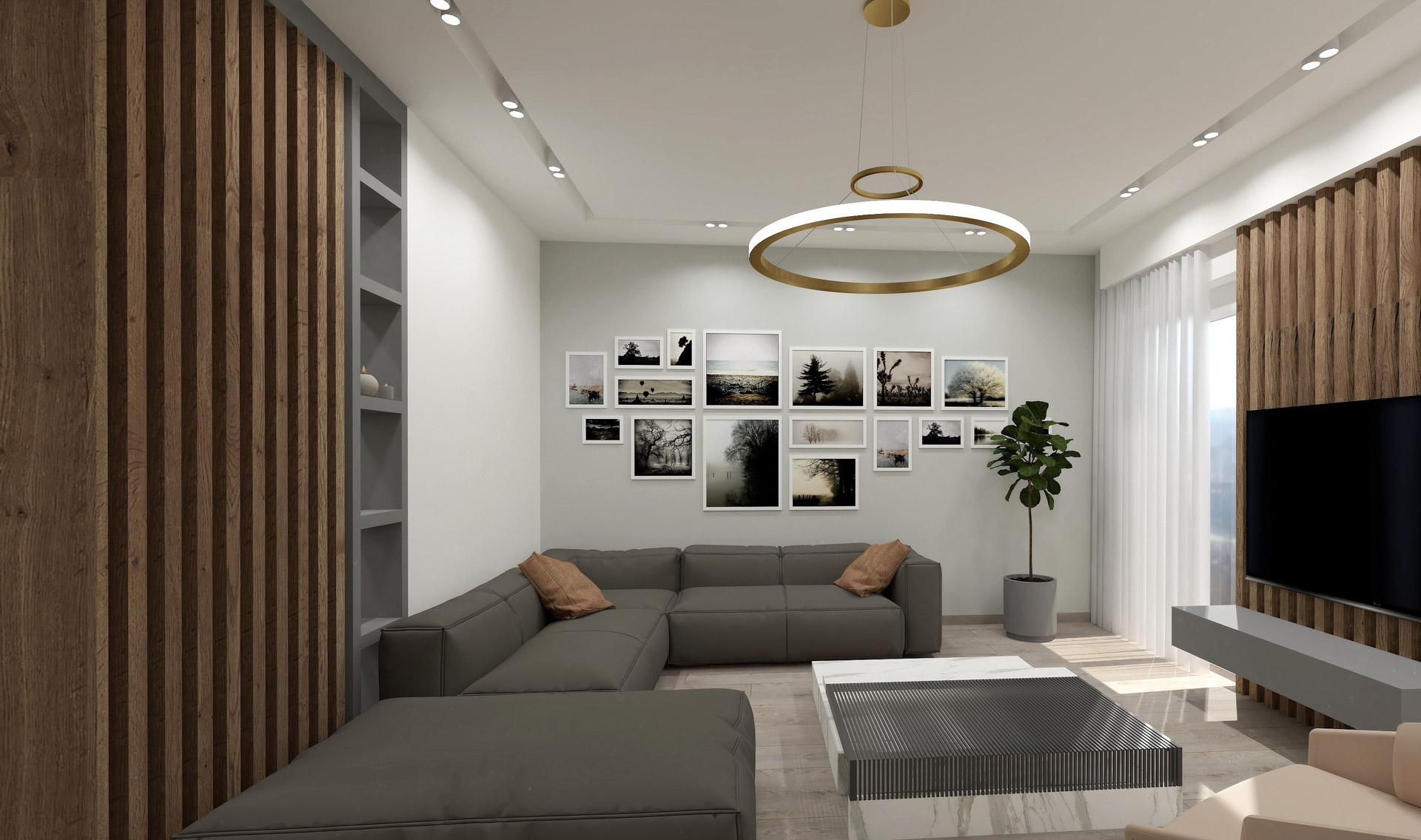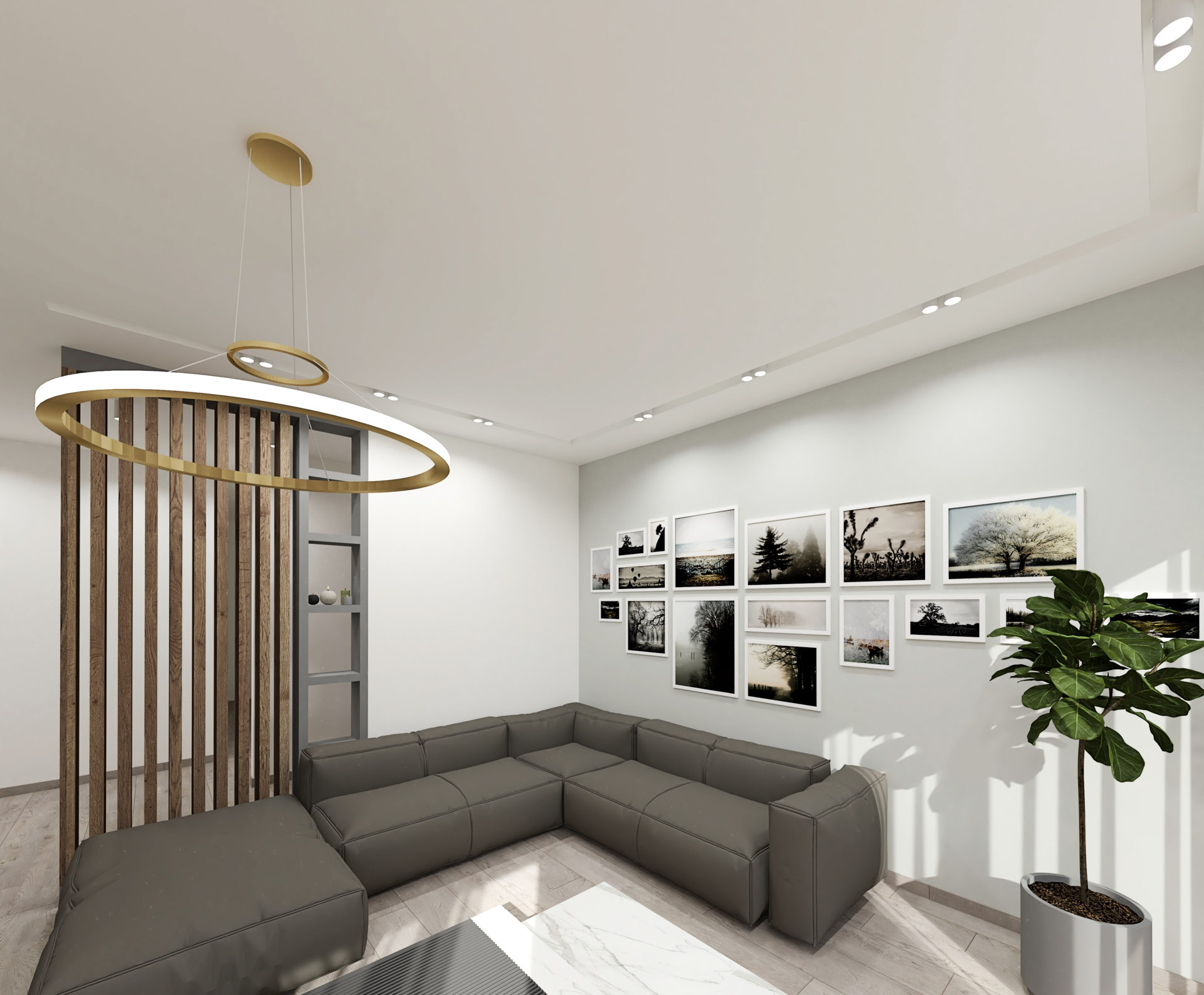Το έργο αφορά διαμέρισμα πολυκατοικίας του 1980 επιφάνειας 90τ.μ. στην πόλη των Ιωαννίνων. Στόχος του σχεδιασμού ήταν μια διαρρύθμιση που θα έδινε στο διαμέρισμα καλύτερη ροή αλλά και ευέλικτους χώρους. Χρησιμοποιώντας μια παλέτα του γκρι αλλά και εξοπλίζοντας με ξύλο καρυδιάς τον κεντρικό όγκο του πυρήνα της κατοικίας δημιουργήσαμε ένα χώρα που προσφέρει μια ζεστή υφή με μία ατμοσφαιρική διάθεση.